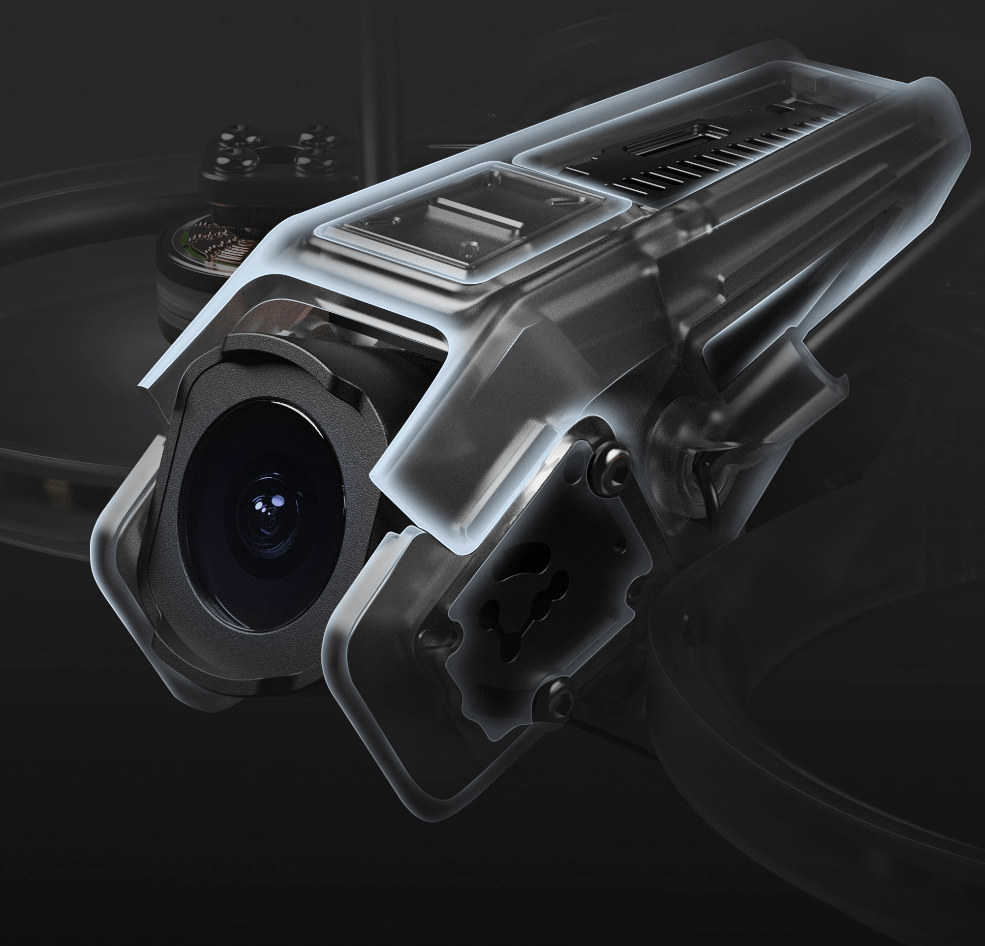 防护外壳做工精细,用料扎实,有效保护摄像头,同时增强相机防抖性能,显著提升飞行中画面的稳定性。